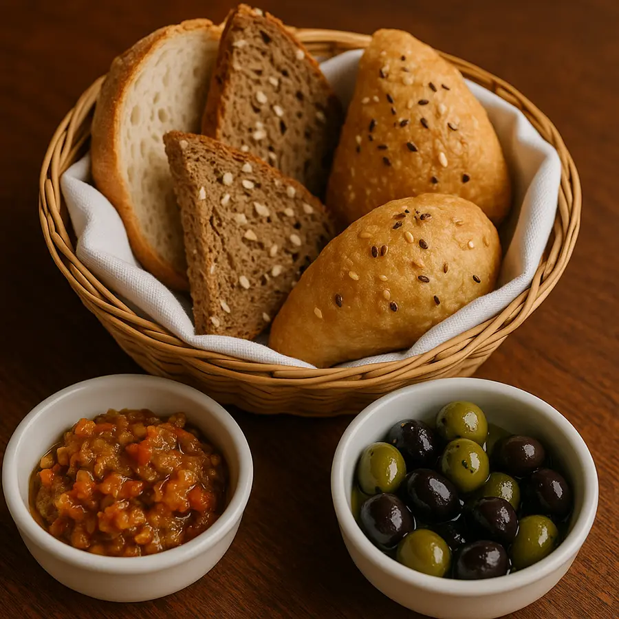 Couvert de pães da casa com antepasto do dia e azeitonas