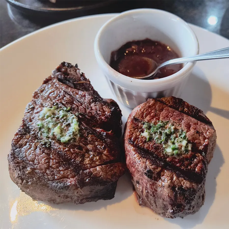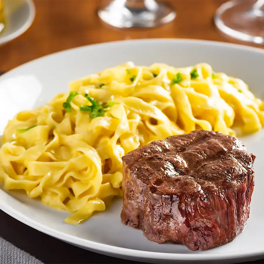 Medalhão de Mignon com fonduta de queijos regionais + fettucine da casa na manteiga