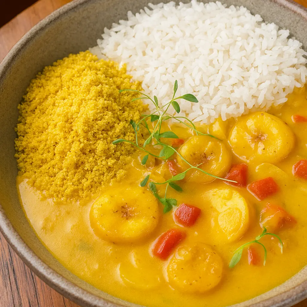 Moqueca vegana de pupunha com farofa de banana da terra e arroz