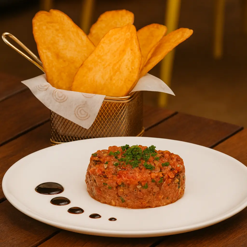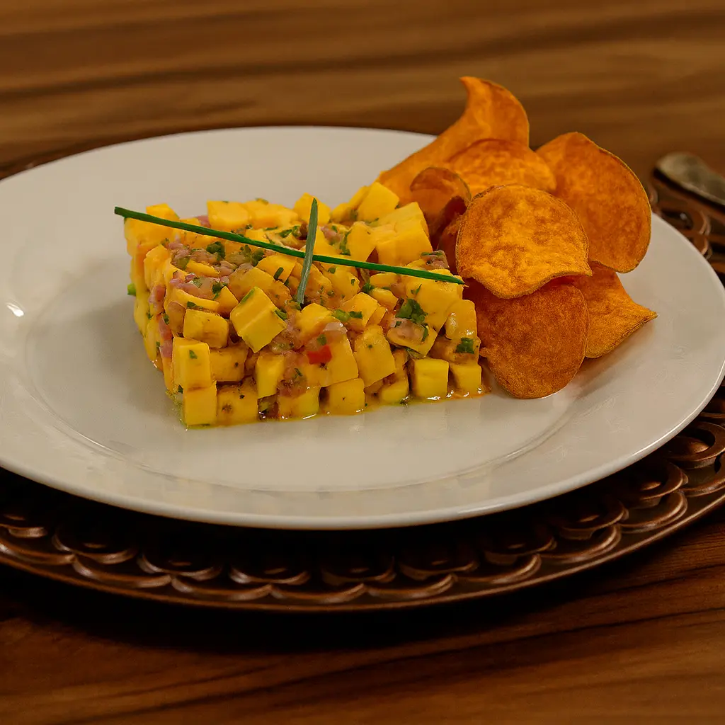 Steak Tartare vegano de banana da terra com chips de batata doce