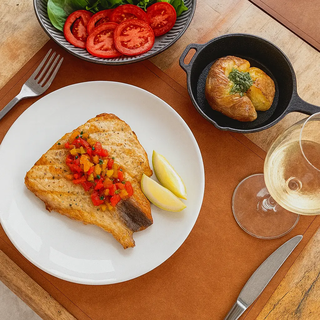 Entrecote com batatas assadas na manteiga e arroz Ferreira.